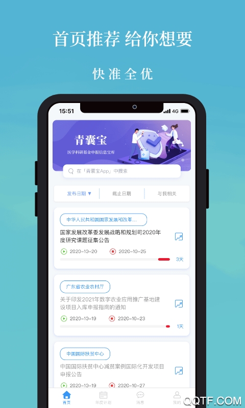 青囊宝课题基金app安卓版是一款靠谱的有保障的基金理财软件,平台上有大量最新的课题基金项目,首页推荐给你想要的理财项目,各种全面的年度计划让你做好准备,在这里不仅能了解到前沿的学术知识,还能通过投资理财获